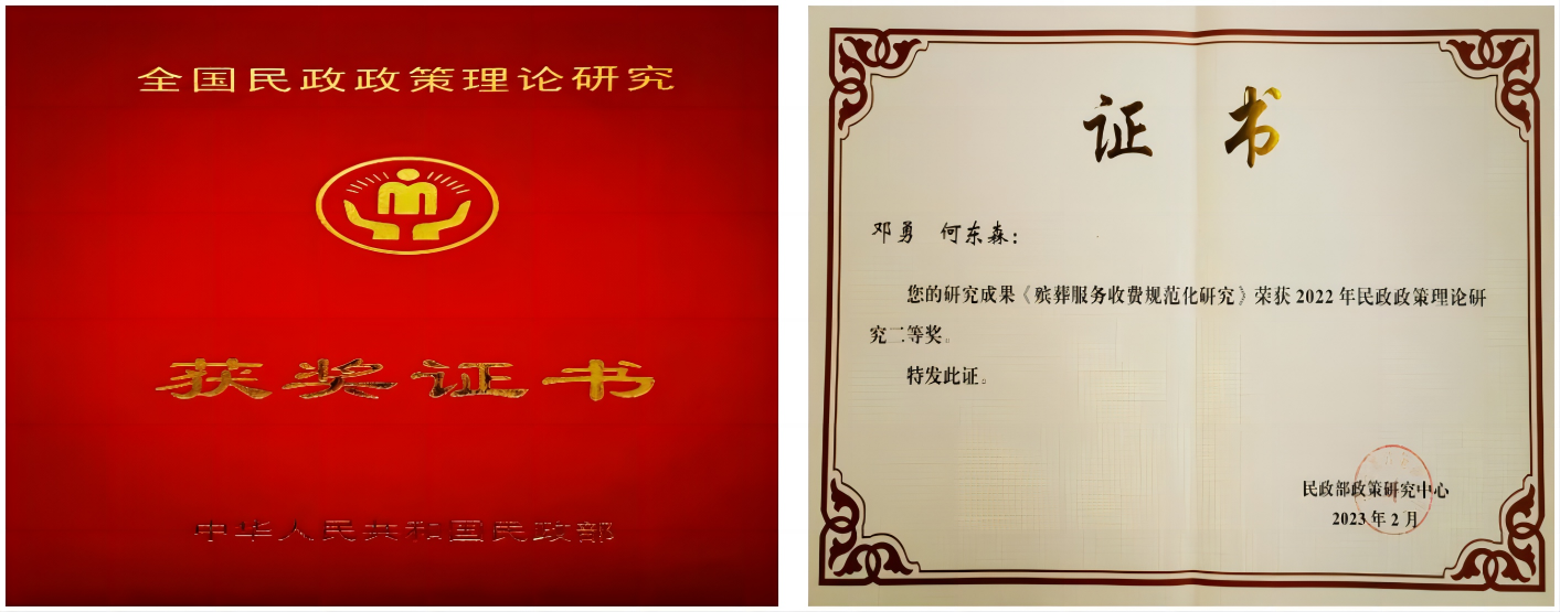 近日,我院法律系邓勇教授团队收到了民政部颁发的全国民政政策理论研究获奖证书。邓勇教授与其指导的2021级法律硕士研究生何东森的研究成果《殡葬服务收费规范化研究》荣获2022年民政部全国民政政策理论研究二等奖。
