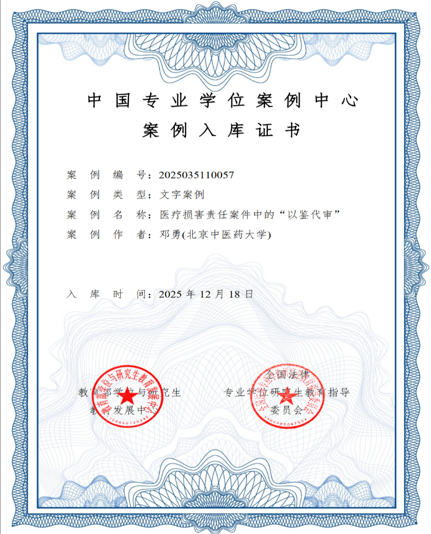 近日,中国专业学位教学案例中心2025年度教学案例入库评审结果公布,Betway必威法律系邓勇教授团队(23级法律硕士研究生高薇涵、24级医药卫生法学硕士研究生薛端英等)撰写的案例《医疗损害责任案件中的“以鉴代审”》经全国法律硕士专业学位教育指导委员会组织专家初审和会审,在全国各大法学院校申报的数百个案例中脱颖而出,成功入选中国专业学位教学案例中心第五批法律硕士专业学位文字教学案例库。