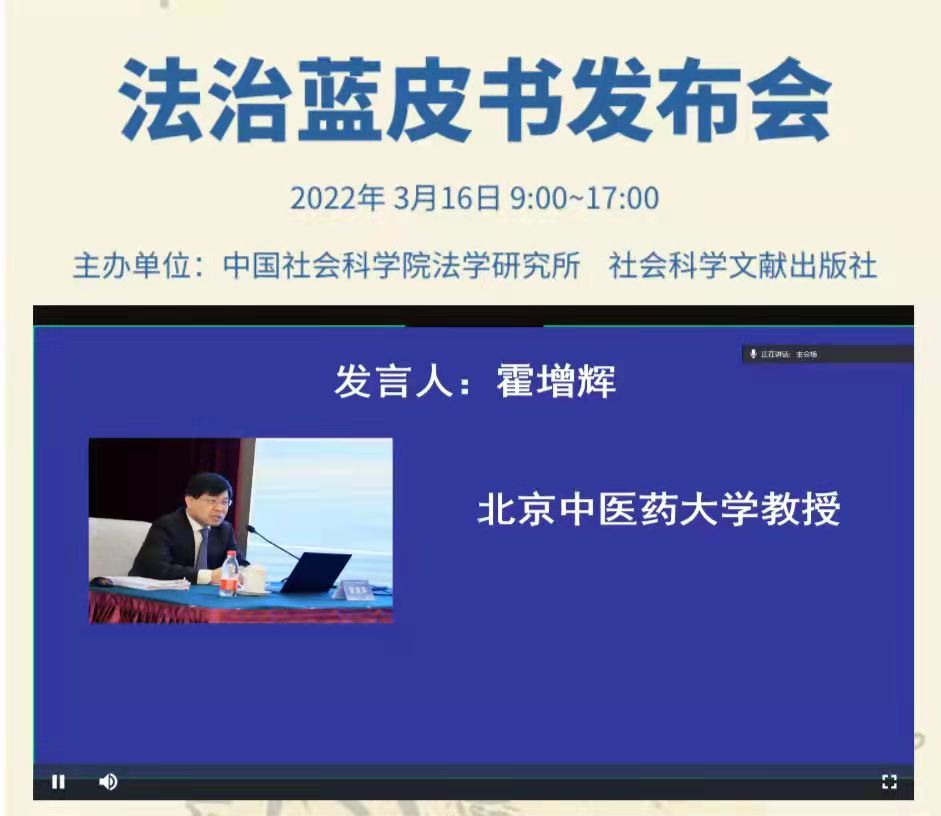 2022年3月16日中国社会科学院法学研究所、社会科学文献出版社主办的法治蓝皮书发布会在中国社会科学院法学所召开。我院霍增辉教授应邀就其研究成果《中医医术确有专长人员医师资格考核研究报告》做专题发布。