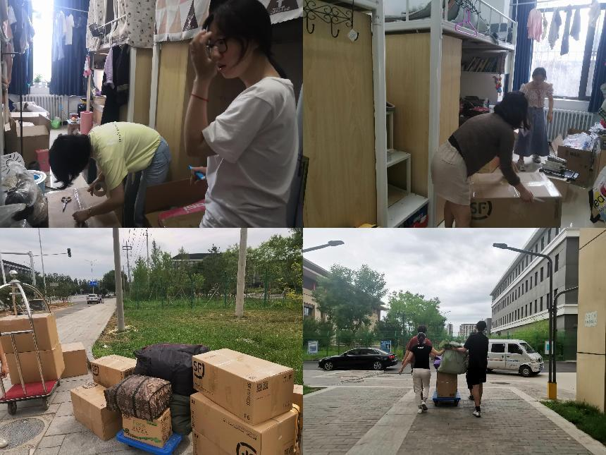 在为学生整理宿舍物品时,志愿者们通过视频方式与毕业生沟通交流,分工配合,按照毕业生的要求细心查找、精心整理,将个人物品进行分类收纳,确保学生个人物品准确齐全,采用手提肩扛、小推车、三轮车等方式运送行李;在结算费用时与工作人员一起清点、称重,将每一份快递单拍照留存。其间遇到的小问题在大家的共同商讨、行动下也很快地得到了解决。