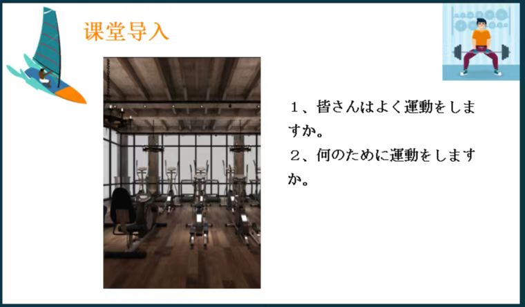 高琳琳老师的教学主题为“ジム”,针对教学对象为已有1学年日语学习经历的非日语专业学生的特点,高老师的授课采用对分课堂教学模式和产出导向法进行。教学演示环节围绕体育锻炼这一主题,首先进行问题式导入;主题课文部分,侧重对重点词汇和句型的讲解及操练;练习环节由分组练习及个人练习构成;课后作业包含小作文等形式。教学过程注重与学生的互动交流及语言技能的训练,强调语言能力的产出。
