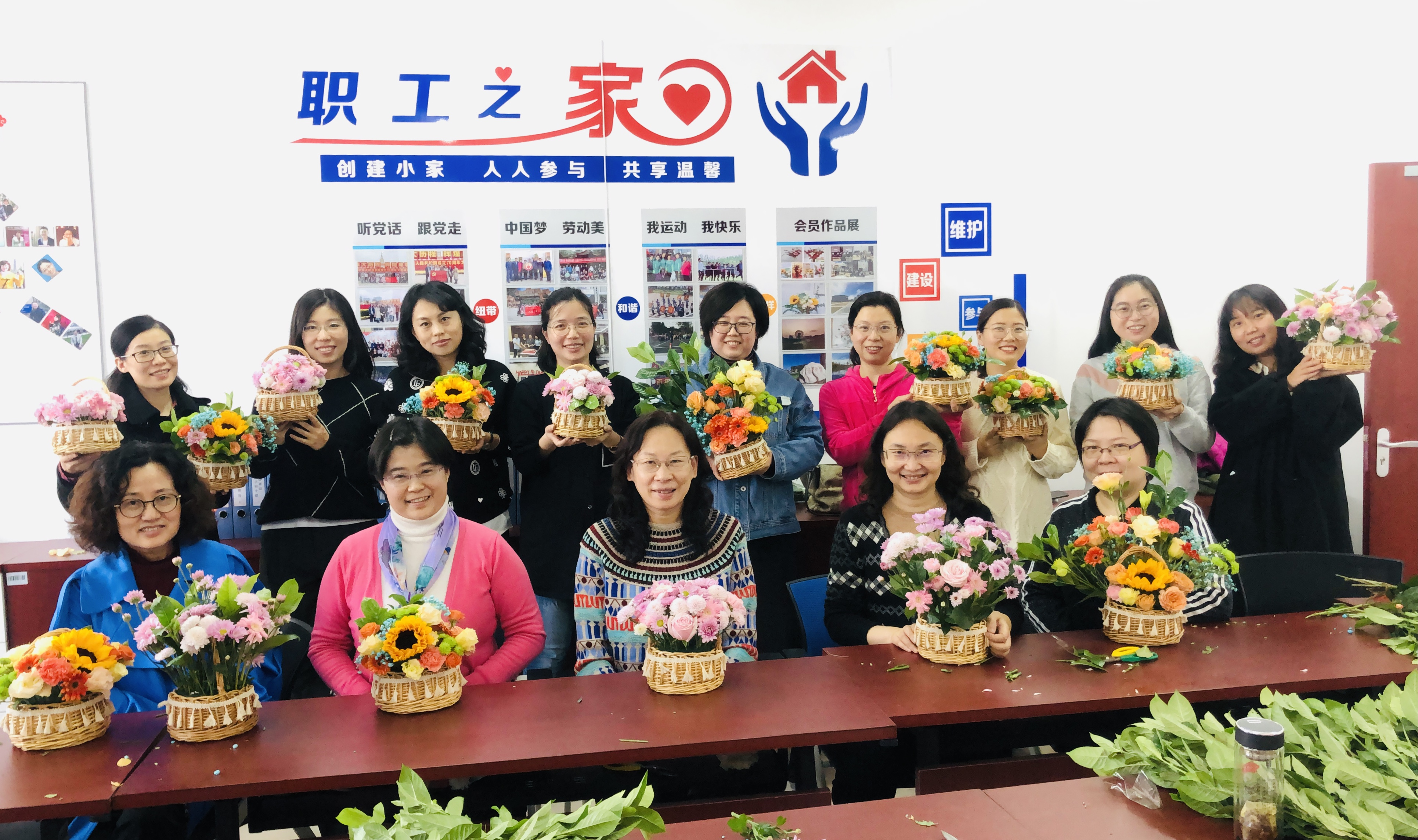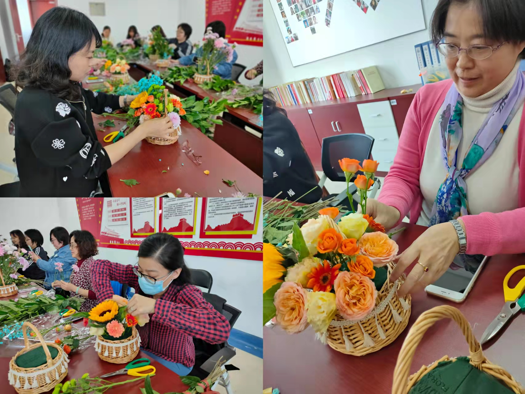 在专业人员的指导下,每位老师发挥奇思妙想和审美功力,通过 精心挑选和修剪搭配,将多头玫瑰、弗朗、康乃馨、尤加利叶、满天星、玫瑰等等新鲜的花材完美地融合到花篮中,最终形成了类型多样,色彩缤纷的优秀插花作品。