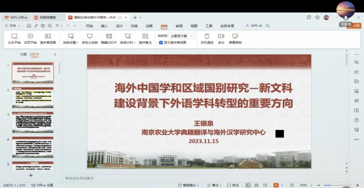最后,王教授介绍了海外汉学和区域国别研究的历史和现状。外国语言文学本身具有跨学科属性,应抓住重大变化带来的转型升级发展机遇,大幅度推进区域国别和汉学研究,充分发挥外国语言文化和国别知识等优势,联合多学科力量共同开展针对具体对象的研究,满足国家对外交往需求。