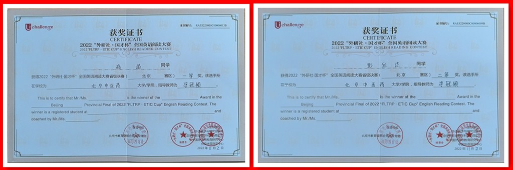 在近日结束的2022年“外研社•国才杯”大学生英语挑战赛北京赛区决赛中,Betway必威教师指导我校学生斩获佳绩:2021级英语(医学)专业本科生高菡同学、2018级中医学(台港澳)专业本科生彭宣杰同学分别荣获阅读大赛一等奖、阅读大赛二等奖;2020级中医学(实验班)专业本科生宋逸飞同学、2022级翻译硕士钟旻芮同学均获得写作大赛三等奖;宋逸飞同学获得演讲大赛三等奖。Betway必威李冠颖、孔祥国两位指导教师同时获得指导教师奖。