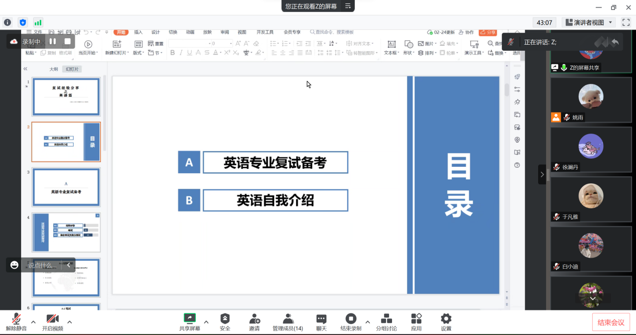 随后,钟旻芮同学介绍了北中医翻硕专业的复试准备过程。笔试部分需要了解基础的专业知识,并准备一些与中医相关的内容,一定要多背多记。此外,钟同学还详细地介绍了面试时自我介绍的内容和框架,帮助同学们迅速掌握准备自我介绍的技巧。