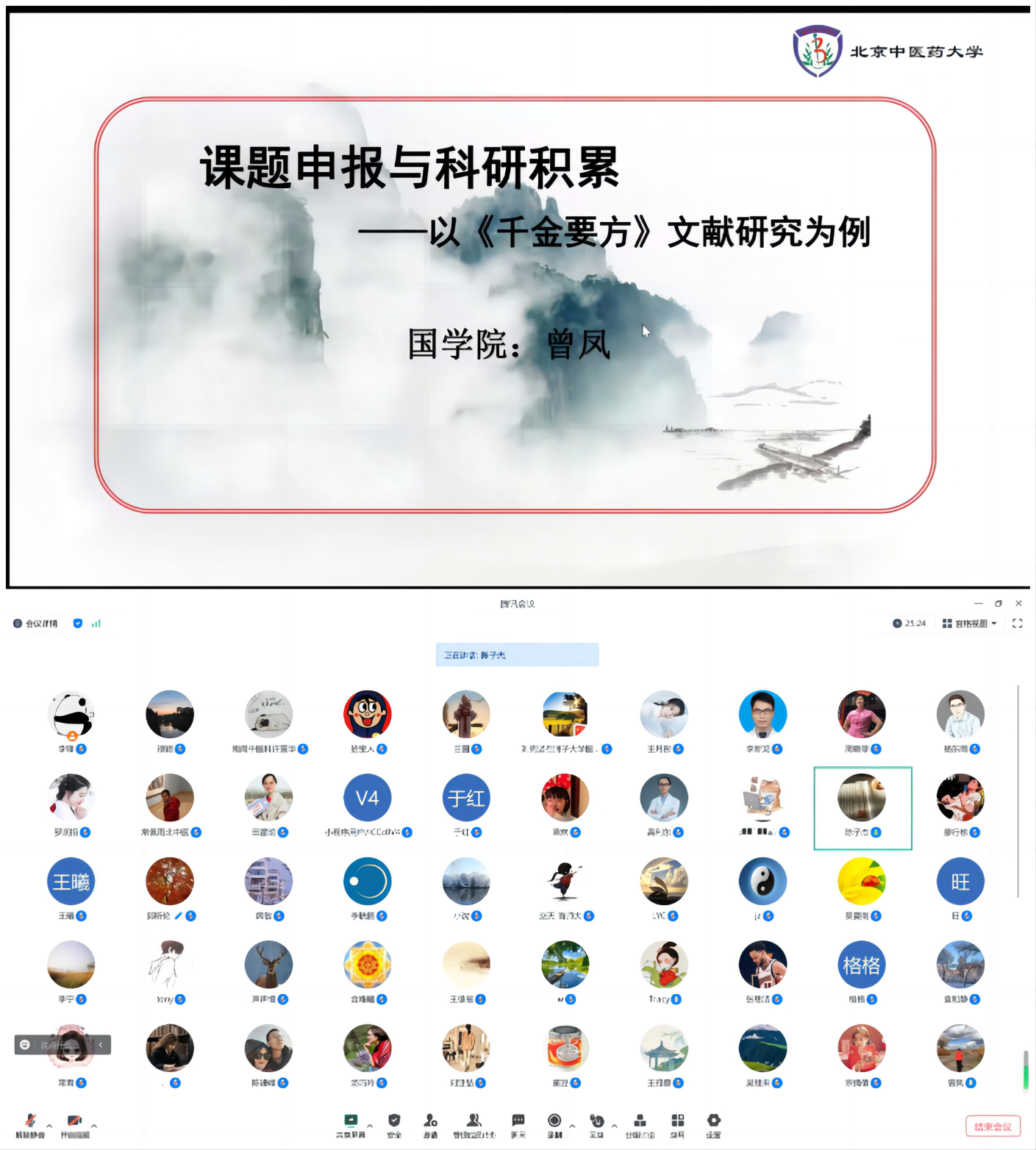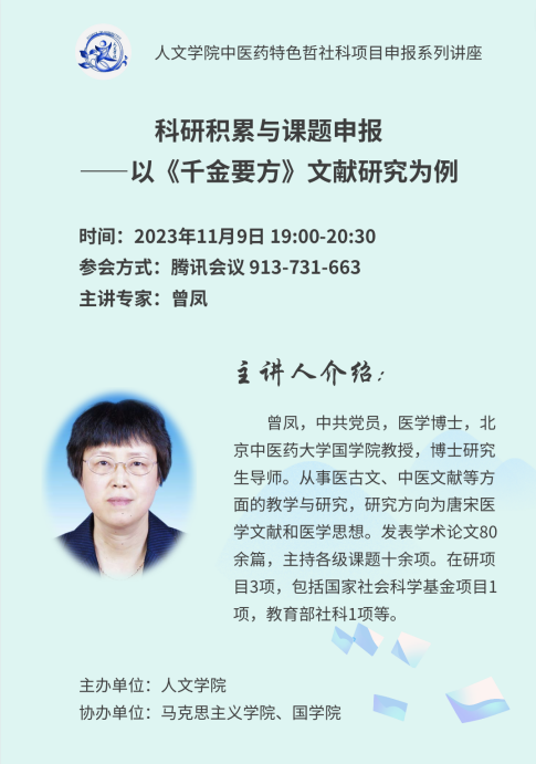 为了进一步提升我院人文社科的科研能力和水平,更好地营造追求卓越的学术氛围,2023年11月9日晚,Betway必威国学院教授、博士研究生导师曾凤教授通过腾讯会议为各学院教师作题为“科研积累与课题申报——以《千金要方》文献研究为例”的学术讲座。讲座由人文学院副院长陈子杰教授主持,100余名教师聆听了讲座。本次中医药特色哲社科项目申报系列讲座由Betway必威主办,马克思主义学院和国学院协办。