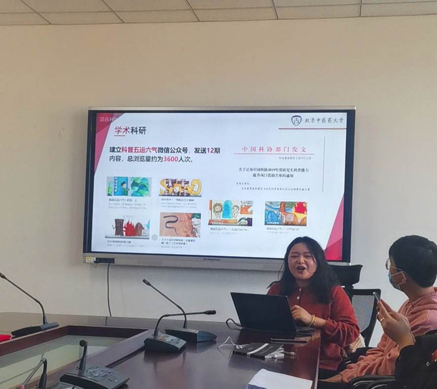 在课题参与方面,叶柳倩同学谈到自己参与了国家科协科普“五运六气”的课题,她本人主要负责使用微信公众号科普有关知识。公众号至今共运营12期,每期她都付出了很大的努力。起初她没有经验,凭借兴趣完成撰稿。后来她通过查阅资料、自学、参加本校选修课等方法加深了对“五运六气”的认识,宣传的效果也由此变得越来越好。