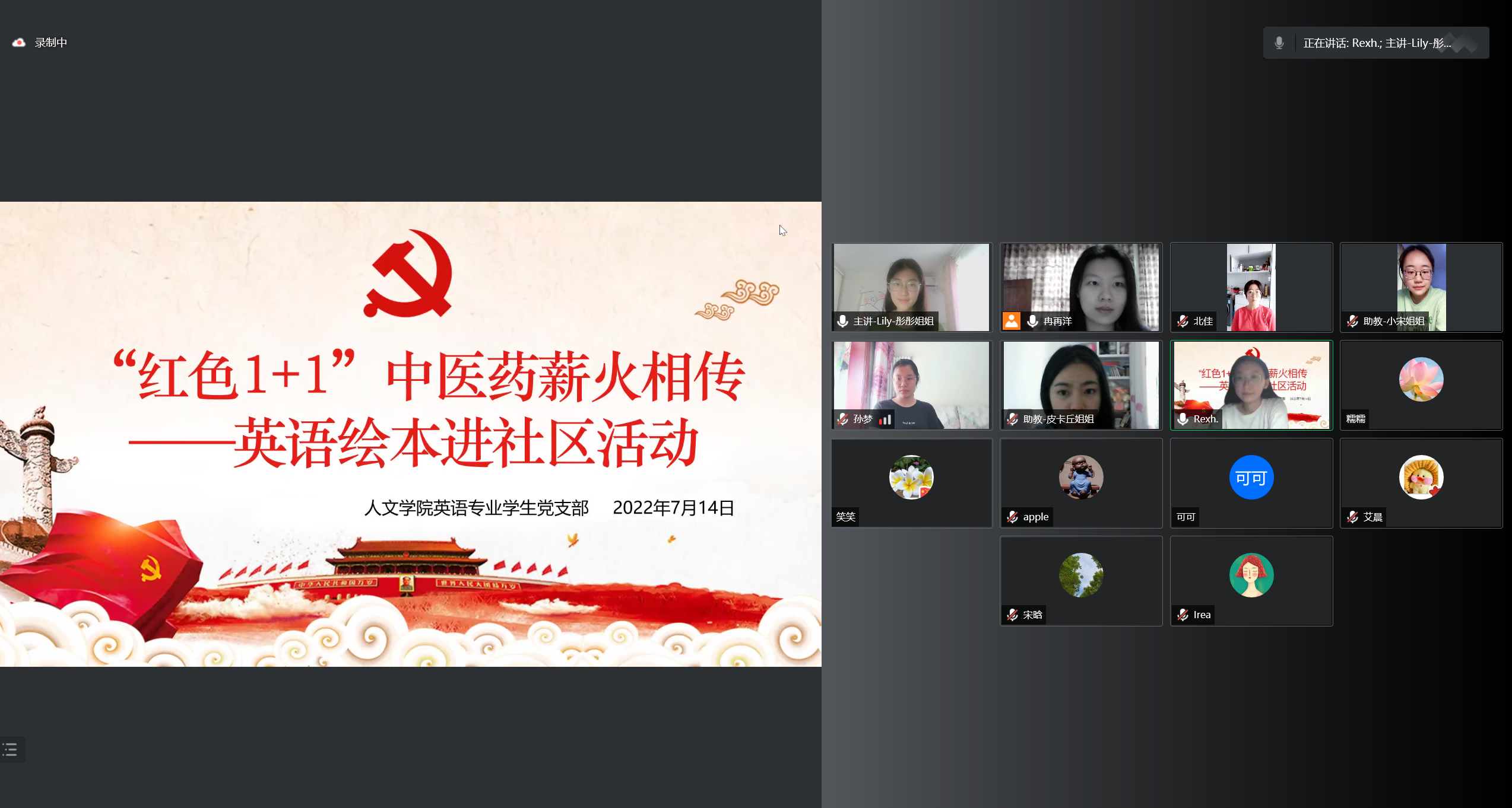 为响应“中医药振兴发展”的号召,增强党员与群众的联系、强化服务意识,2022年7月14日,Betway必威英语专业学生党支部联合房山区西潞街道海逸半岛社区党总支开展“红色1+1”中医药薪火相传------英文绘本进社区系列活动。本次活动采用线上腾讯会议的形式举行,共计十四人参与,其中志愿者八名,来自社区的家长和小朋友共六名。活动以英文绘本为主要教学材料,辅以网络优质资源丰富活动形式,由志愿者主讲,以互动方式带动孩子们积极参与,活动内容包括为自我介绍、歌曲学唱、绘本阅读和趣味绘画。