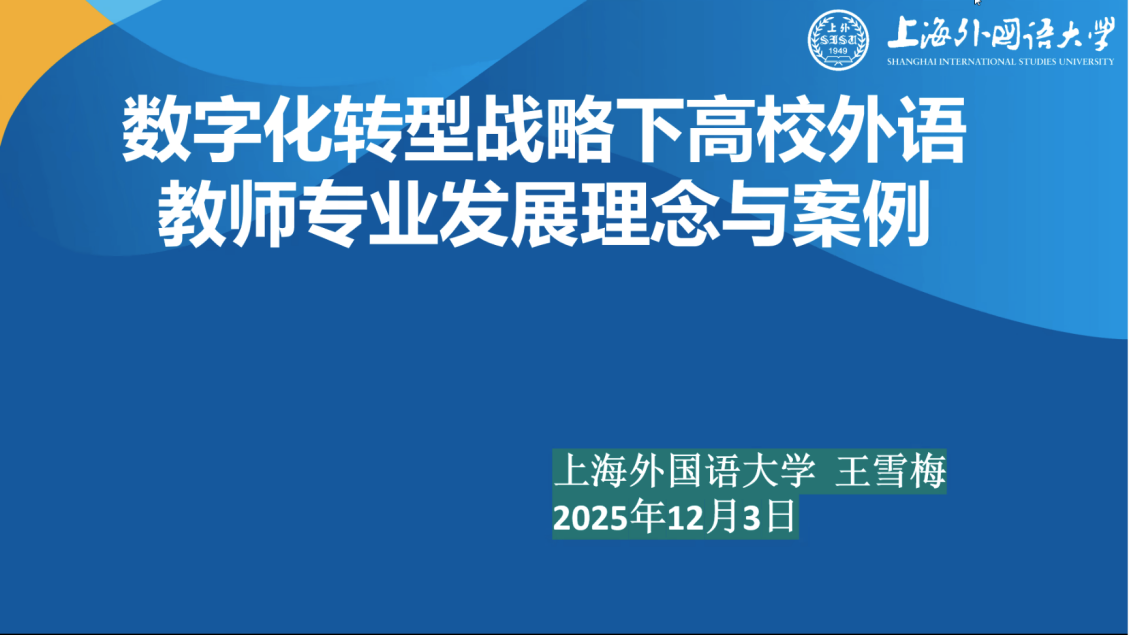 2025年12月3日下午,Betway必威在线举办“人文·青囊”大讲堂暨2025年度教学质量月专题讲座,邀请上海外国语大学王雪梅教授担任主讲嘉宾,分享“数字化转型战略下高校外语教师专业发展理念与案例”的前沿议题。Betway必威英语系、公共外语部教师参加讲座,讲座由孔祥国副院长主持。