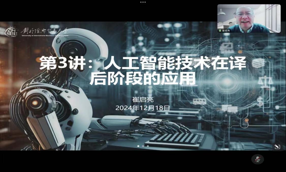 2024年12月18日晚19点,Betway必威特邀对外经济贸易大学崔启亮教授通过线上腾讯会议方式为Betway必威师生带来系列讲座第三场之“人工智能技术在译后阶段的应用”专题讲座,讲座由孔祥国副院长主持。