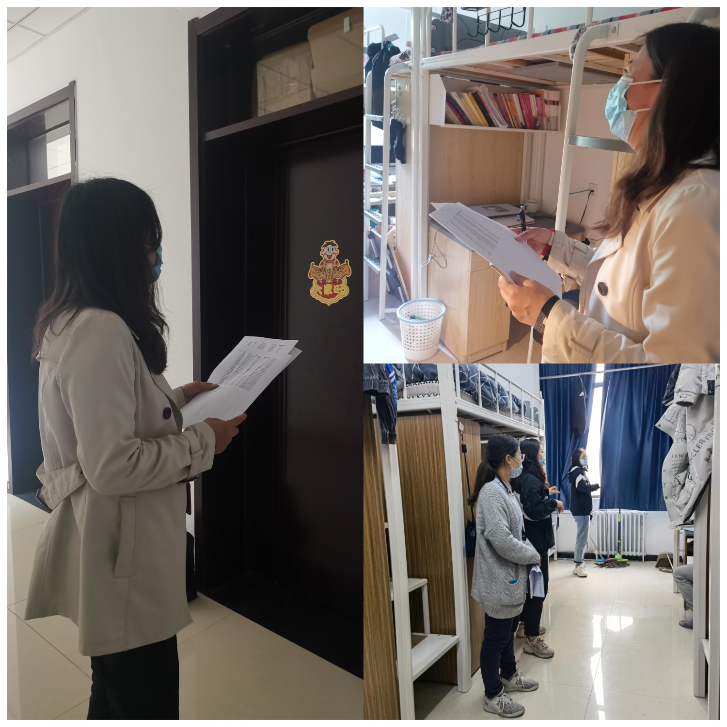 首先,为给学生营造一个安全、健康、和谐的宿舍环境,保障学生在校的生命财产安全,谭静副书记带领学生办公室老师检查学生宿舍安全,检查过程中嘱咐学生注意防火、用电和疫情防控等安全问题。