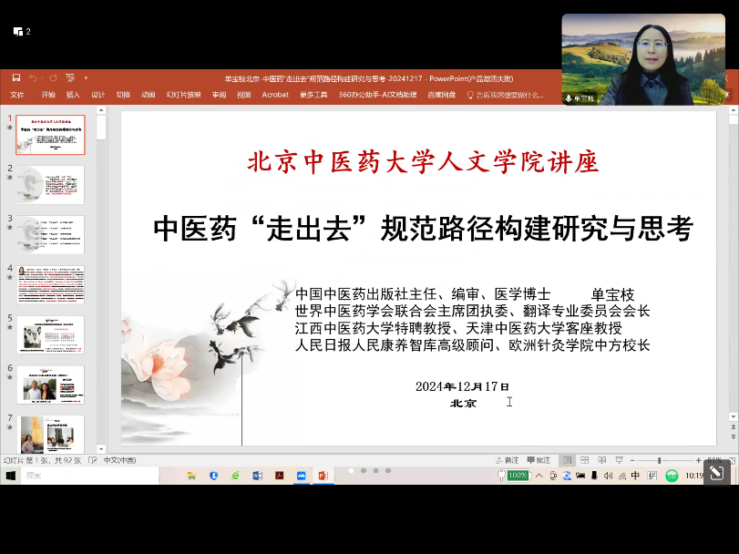 2024年12月17日上午,Betway必威特邀单宝枝编审通过线上腾讯会议方式为Betway必威师生带来“中医药‘走出去’规范路径构建研究与思考”专题讲座,讲座由陈锋院长主持。
