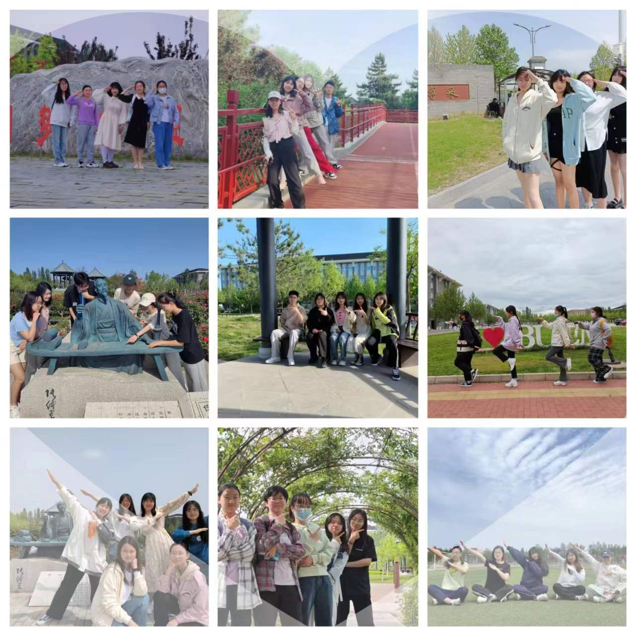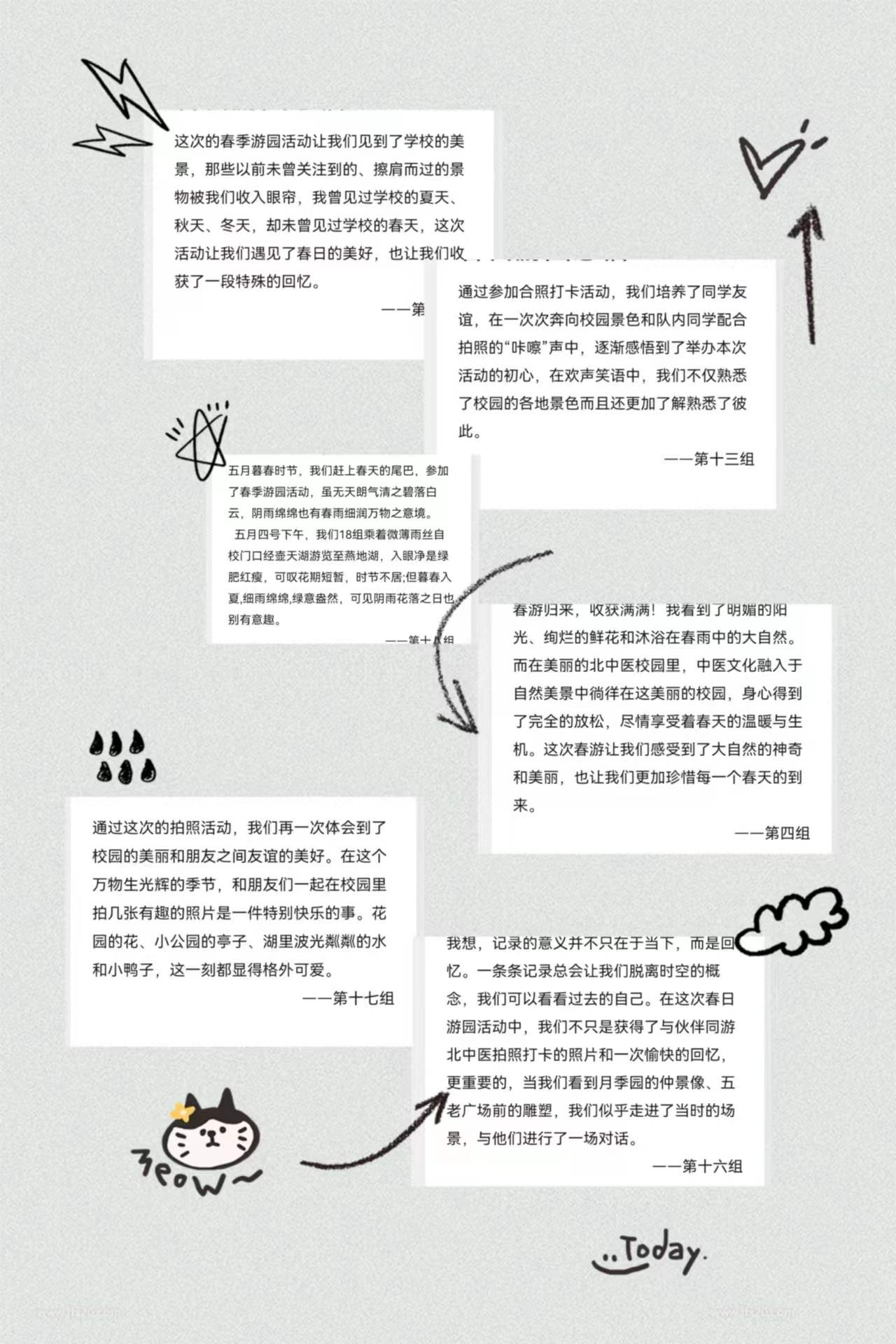 本次活动面向全校学生,以线下参与、线上收集的形式,接收参与报名同学的投稿照片以及感想。本次春季游园活动中,工作人员提前将参与活动的同学进行组队,提供指定地点与特定的姿势以供拍照打卡,同学们可将自己在北中医校园拍照打卡过程中产生的所思所感写成信件投稿。在本次活动中,同学们参与热情较高,报名人数多达一百余名,截止5月10日,共收到19组同学的拍照打卡照片。