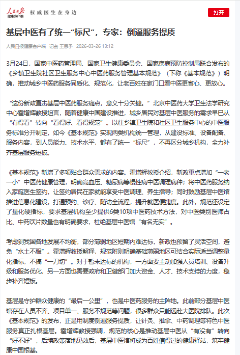 3月26日 人民日报健康客户端刊登我校Betway必威霍增辉教授解读《乡镇卫生院社区卫生服务中心中医药服务管理基本规范》,全文如下: