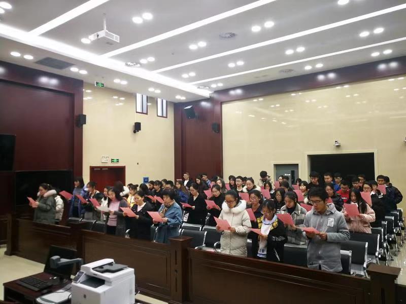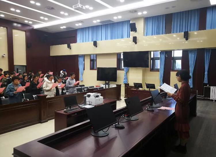 此次活动的目的在于让同学们诵读宪法,学习宪法,遵守宪法。活动过程中,2017级和2019级的法学班同学们齐聚在模拟法庭,他们拿起宪法的条文,在领诵人的带领下铿锵有力地读出了他们对于宪法的那份敬畏与尊重。老师和同学们的每一句都读的认真、读的有力,让人听得动容、心潮澎湃。