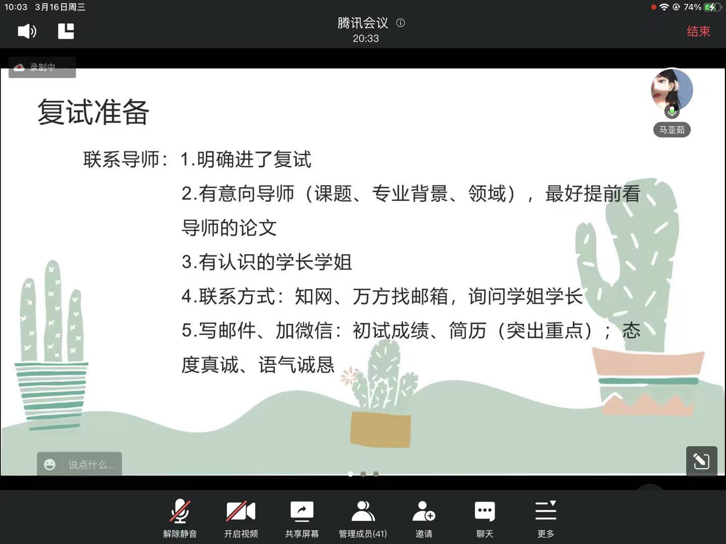 接下来,由马亚茹学姐结合自身的考研复试经验,为即将参加复试的2018级同学们讲解考研复试的相关准备工作如何进行。学姐提醒大家面试一定要反复琢磨练习、导师一定要提前联系。
