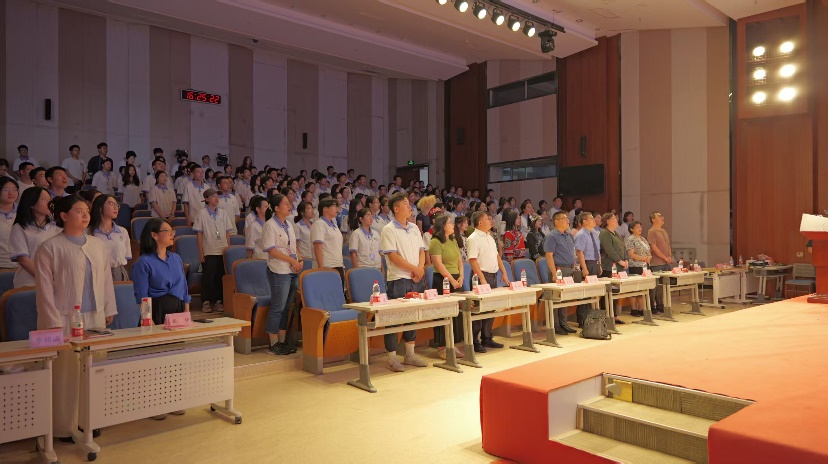随后,全体起立,奏唱《中华人民共和国国歌》,激昂的旋律在场内悠扬,爱国的情怀在每位师生心中激荡。