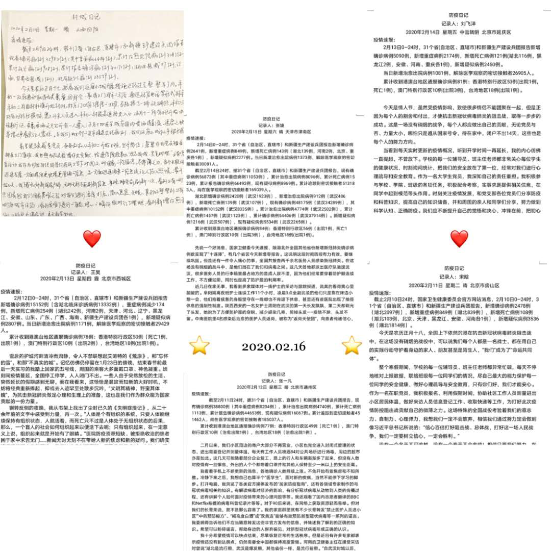 此次活动分为三部分。活动一为全体成员编写防疫日记,全体党员按照既定顺序,从2月10日由张笑愉同学开始至3月3日严格同学结束,每天由一位党员写一篇防疫日记。每位党员在日记中不仅写出了当日的全国疫情速报、家乡的变化以及当地政府所采取的措施,还写出了自己自疫情开始以来的真情实感以及对武汉还有中国的祝福。宋晗老师写到:“没有一个冬天不可逾越,没有一个春天不会来临!作为共产党员,我们要行动起来,做好带头表率,积蓄力量,共克时艰!”在谈及身处互联网时代的我们时,王昊同学表示“我们分散在无数个家庭中、无数扇紧闭的门后,但我们并不孤独,因为网络使每一位个体紧紧相连”;想到奋斗在防疫一线的白衣战士们时,张婕同学写到:“在这场与疫情和病毒的抗争中,全体医护人员以信仰守护生命之光,待中国的春天到来时,祝愿山河无恙,所有奋战在一线的白衣战士都能平安归来!”此项活动的开展充分展现了学生党员们对于疫情的关注以及对我们伟大的祖国、对奋斗在一线伟大的白衣战士们和与病魔抗争的患者们的美好祝愿。
