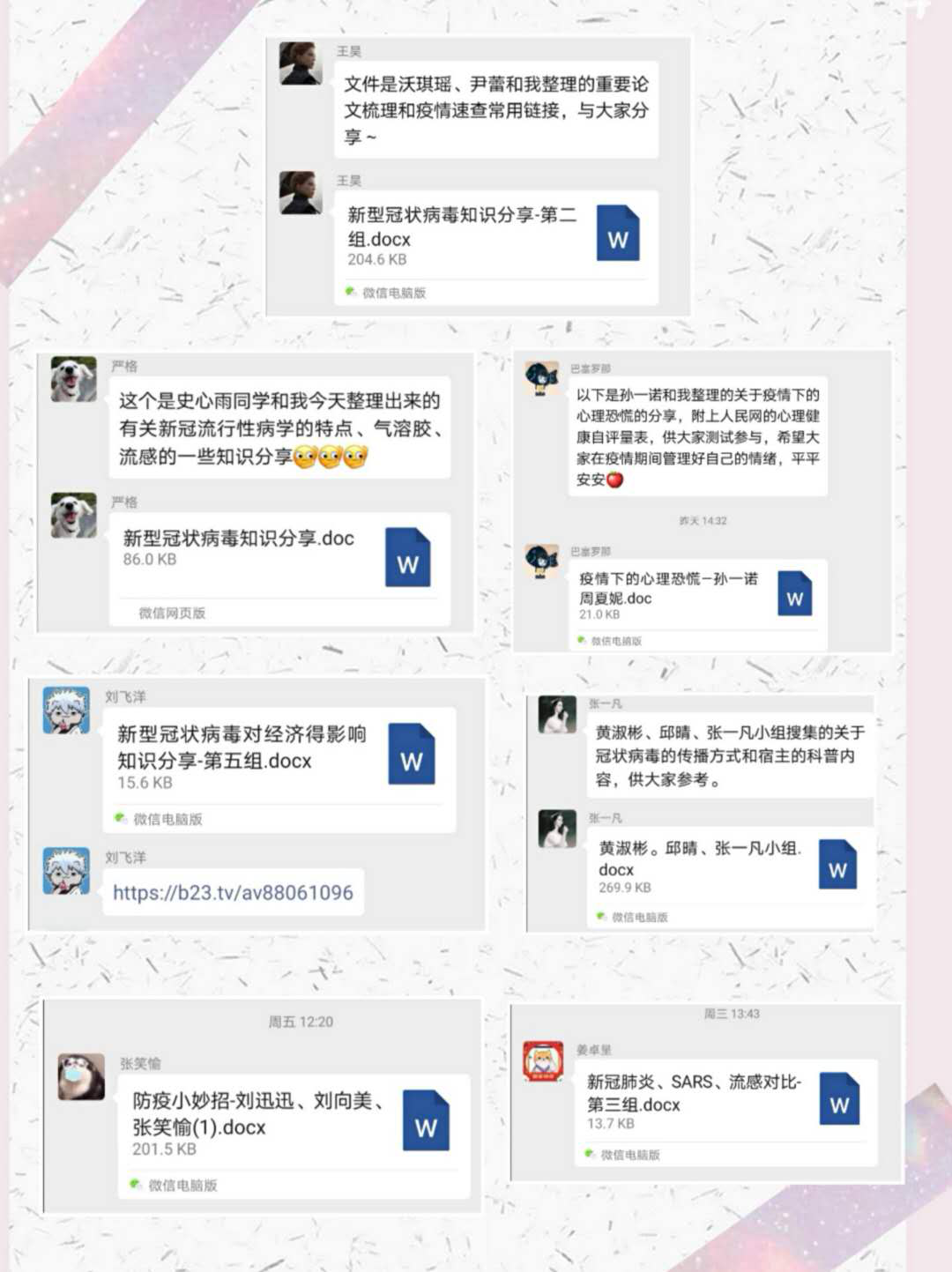 活动二为知识竞赛和知识分享。全体党员积极参与了学校官方发布的新型冠状病毒线上知识竞赛,并自发学习相关知识,每天有一组同学在微信群里给大家分享相关知识,包括新型冠状病毒的科普知识、相关论文梳理、疫情速查常用链接、心理健康量表等等。同学们通过每日的线上分享不仅对疫情有了更加深刻的认识,还加强了支部党员们的沟通与凝聚力。