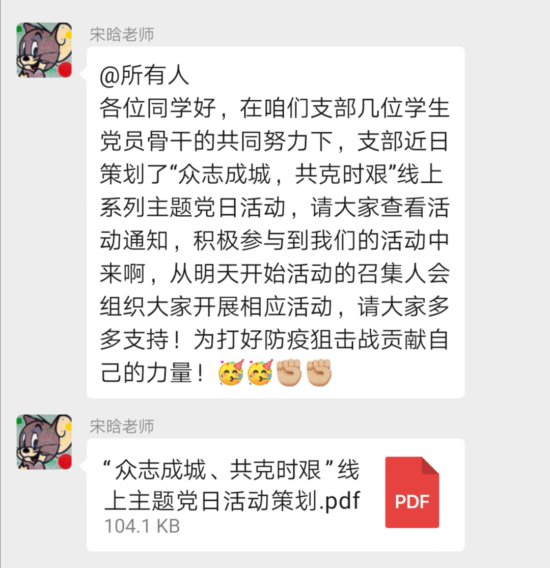 2020年2月10日开始,Betway必威英语专业学生党支部开展“众志成城、共克时艰”线上主题党日活动,英语专业学生党支部书记宋晗老师作为活动负责人带领支部全体党员开展本次线上活动。