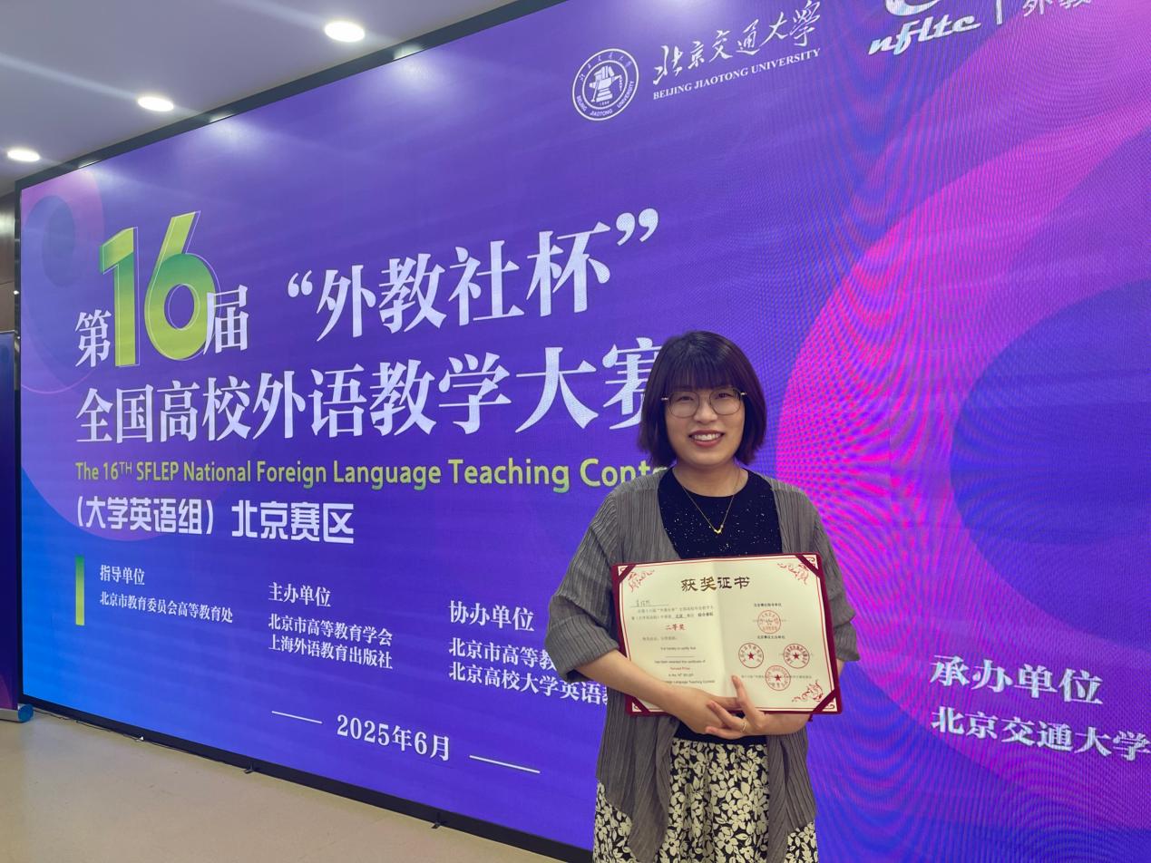 2025年6月7日至8日,第16届“外教社杯”全国高校外语教学大赛(大学英语组)北京赛区复赛、决赛暨颁奖典礼在北京交通大学举办。我校Betway必威公共外语部李怡然老师获得(大学英语组)北京赛区综合组二等奖。北京市高等教育学会会长、北京市教委原主任线联平研究员,北京市教育委员会高等教育处李惊涛处长,教育部高等学校大学外语教学指导委员会委员、北京市高教学会大学英语研究分会理事长、北京大学外国语学院党委书记李淑静教授等嘉宾代表致辞并为获奖选手颁奖。