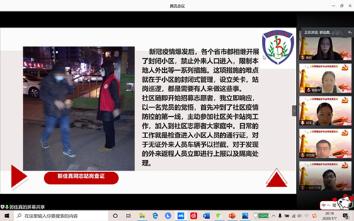 本次组织生活会前,党员同志共分为五组,梳理了支部以及身边的战疫故事,并精心制作了PPT。会议开始,支部书记刘玉老师首先介绍了本次组织生活会的重要性、目的意义。接下来,由每个小组汇报抗击疫情的真实故事,各小组成员分享疫情期间的感悟体会。支部华浩南同志、施然同志、郭佳真同志分别讲述了自己在家乡参加防疫志愿工作的经历,他们不畏艰苦,不惧风险,疫情到来时,敢于勇挑重担,向大家传递信心与正能量,值得每一位党员同志学习;楼俊好同志、刘泓辰同志分别讲述了自己父亲、母亲的抗疫故事,刘泓辰同志讲到在卫生体制内工作的母亲,勇敢奔赴前线,担起转运境外回国人员的重任,在讲述母亲的故事时,刘泓辰落泪了,她说,“如果不是看到母亲的工作日志,都不知道母亲竟然做了那么多工作,任劳任怨,我非常敬佩”,父母为孩子树立了榜样,也让他们更加坚定共产党员的理想信念。