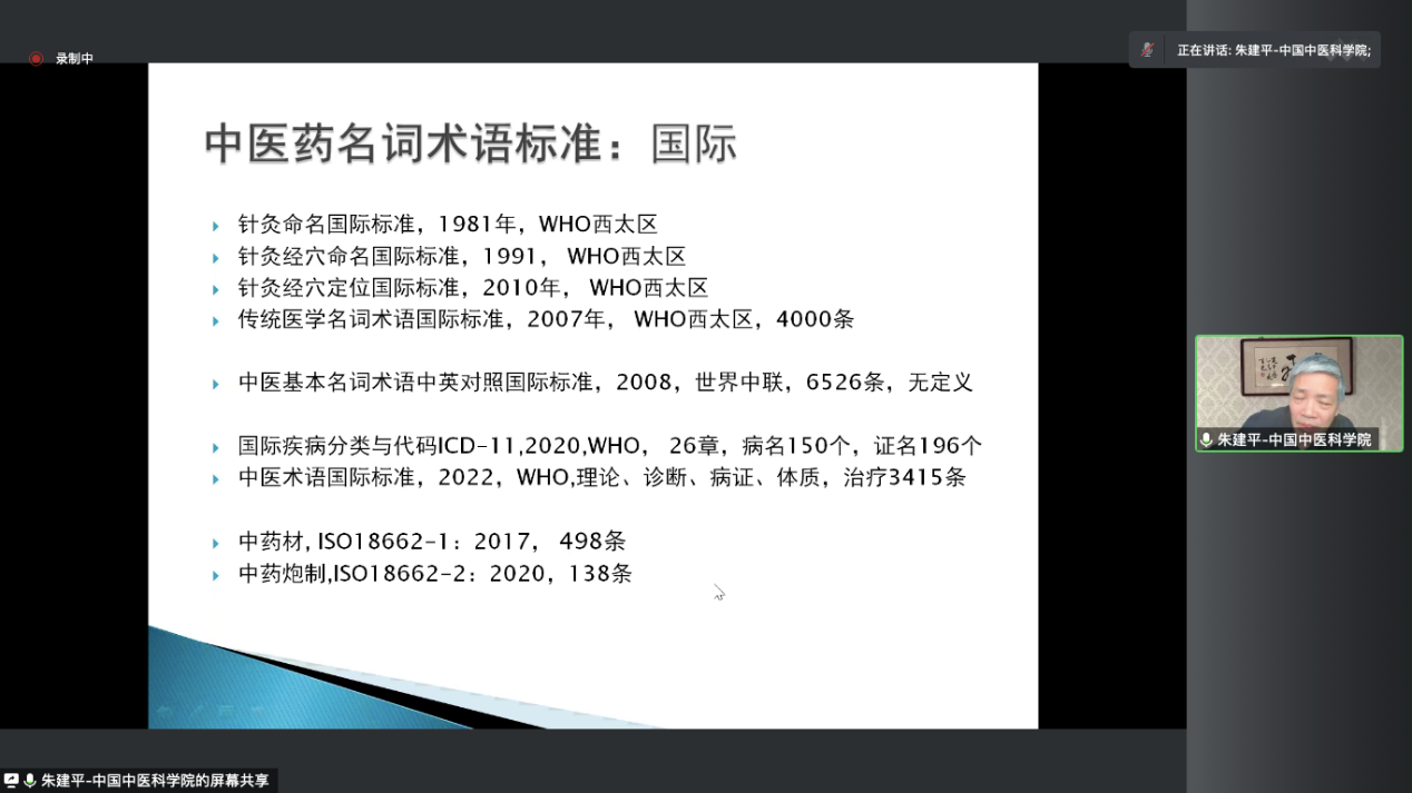 中医药术语规范化是中医药标准化、现代化、产业化、国际化的基础性工作,具有十分重要而深远的意义。朱教授带领大家回顾了我国历年来中医药术语规范化工作的成果和进展,在肯定中医药术语规范化工作进步的同时,针对中医药术语英译规范存在的词义不明、规则不一、缺乏共识这样三个主要问题,结合具体案例提出了相应的对策:明确中医术语概念、遵守术语英译规则、寻求核心术语共识。
