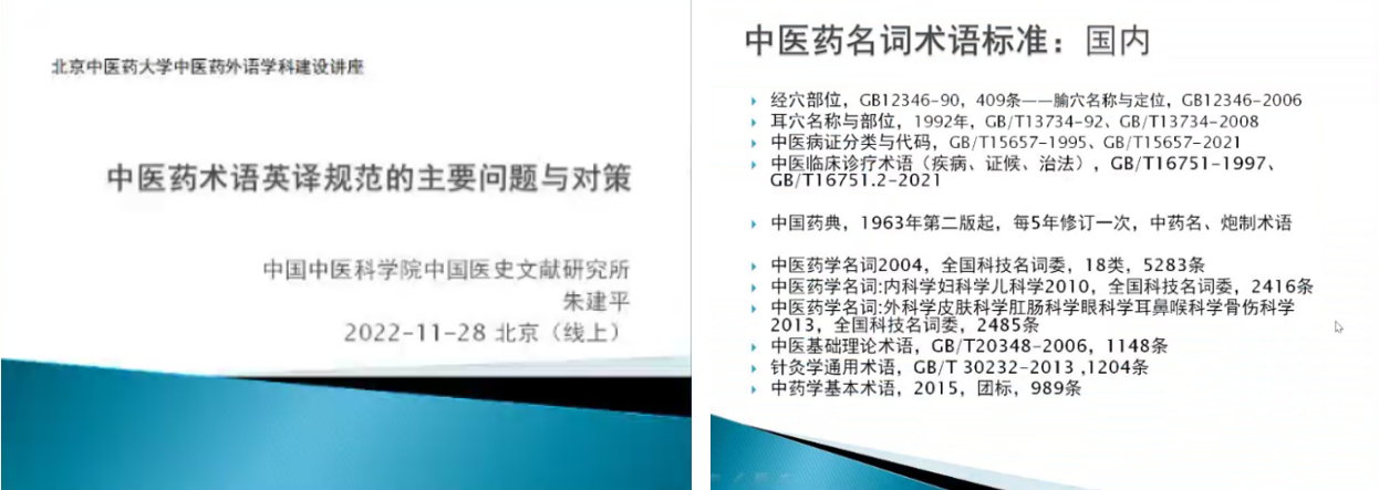 2022年11月28日上午,中国中医科学院特聘首席研究员、博士生导师,中国医史文献研究所原副所长朱建平教授应邀为Betway必威师生带来了一场精彩的线上学术讲座——“中医药术语英译规范的主要问题与对策”。讲座由孔祥国副院长主持,50余位中医药外语及翻译学科师生在云端聆听讲座,并与朱教授交流探讨。