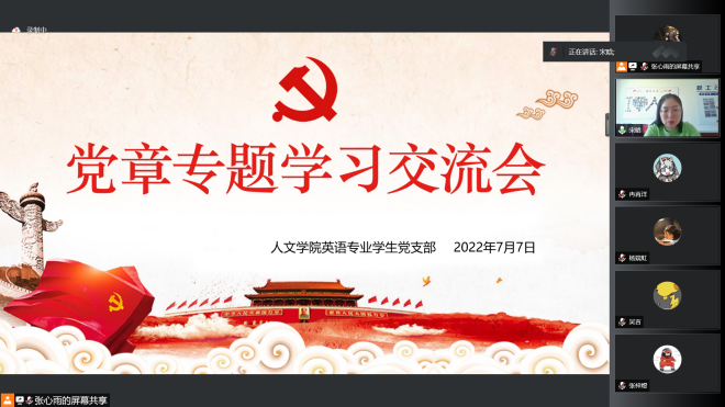 为提升党员党性修养,准确把握党章党规的核心要义,2022年7月7日上午,Betway必威英语专业学生党支部通过线上腾讯会议的形式,成功开展党章专题学习交流会,支部18名党员全员参与此次活动,会议由党支部书记宋晗老师主持。本次党章专题学习交流会以“严守党章党规、做合格党员”为主题,组织全体党员诵读党章,在此基础上,党员们结合生活工作实际,谈体会、谈感受,并集体观看学习视频,加深认识、拓宽视野。