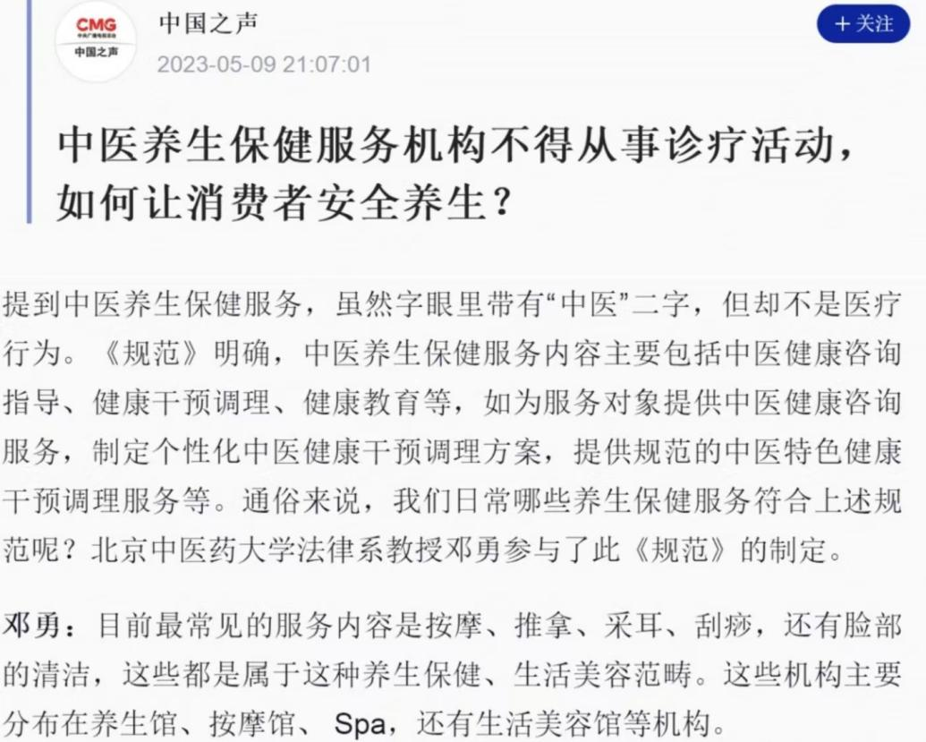 采访中,邓勇教授指出,首先应明确按摩、推拿、采耳、刮痧等日常养生保健服务符合此《规范》;其次,提供中医养生保健服务的工作人员是有一定的中药的理论知识和一定的养生、保健、按摩等实践经验的从业人员,不必象中医师一样必须通过执业医师资格考试,而更多是一种生活型、理疗型、训练型,或者是舒缓型的一些服务者。同时,邓勇教授也发现部分中医养生机构扩大适应范围、夸大养生疗效、把医疗技术当养生技术应用等问题屡见不鲜。