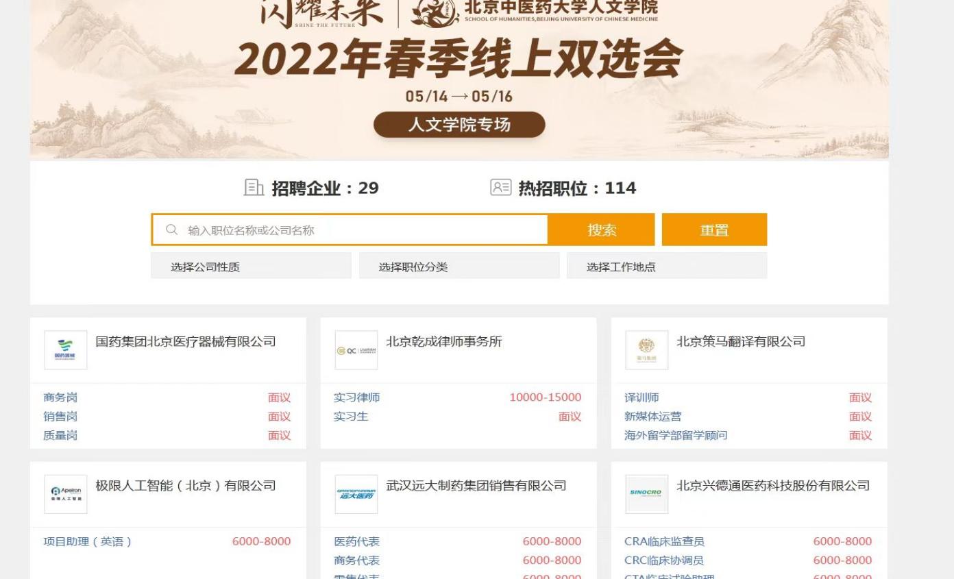 2022年新冠肺炎疫情仍有反复,给毕业生就业工作带来了挑战。为了贯彻落实党中央、国务院关于“稳就业”“保就业”决策部署,抢抓毕业生求职关键期,帮助更多2022届毕业生顺利就业,按照教育部关于举办2022届高校毕业生就业促进活动周的通知要求,Betway必威在五月初举办了毕业生网络招聘宣讲,针对法学专业、英语专业的学生详细介绍了招聘会的岗位,于5月14日—16日顺利组织开展了“2022年Betway必威网络双选会Betway必威专场”,本次双选会依托“医药英才网”平台,采取线上方式举办。