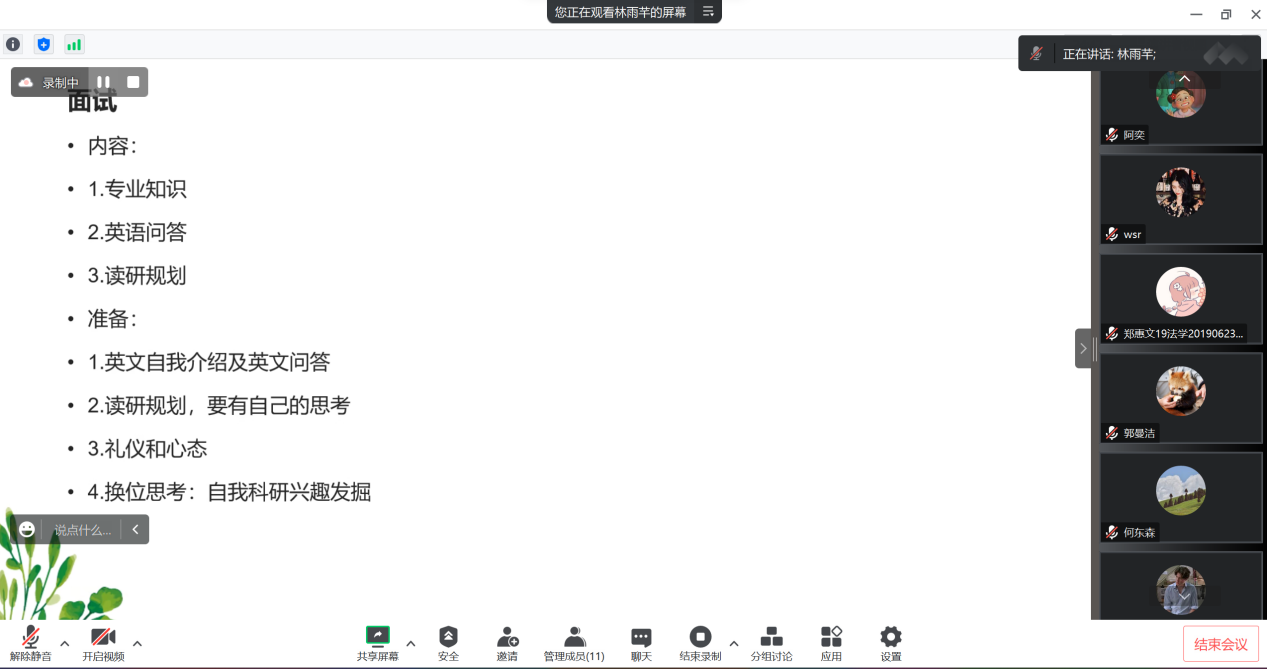 首先,林雨芊结合自身经历为我们介绍了复试中笔试和面试的经验和技巧,笔试和面试都需要提前做足准备,掌握专业知识,表现个人专业能力,保持好心态。